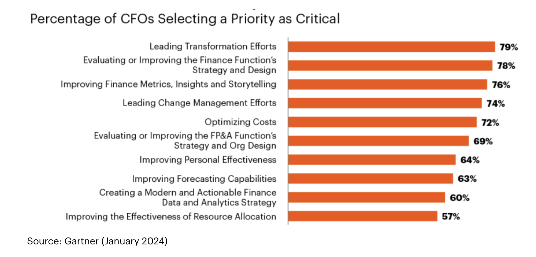 Transformation and improvement are key themes for finance leaders this year, according to a Gartner survey of 185 CFOs. Leading transformation efforts (79%), improving the strategic design and capabilities of finance teams (78%), and improving financial metrics and storytelling (76%) are 3 out of the top 5 important priorities. That’s one.