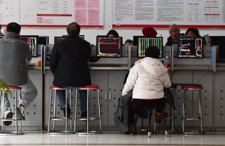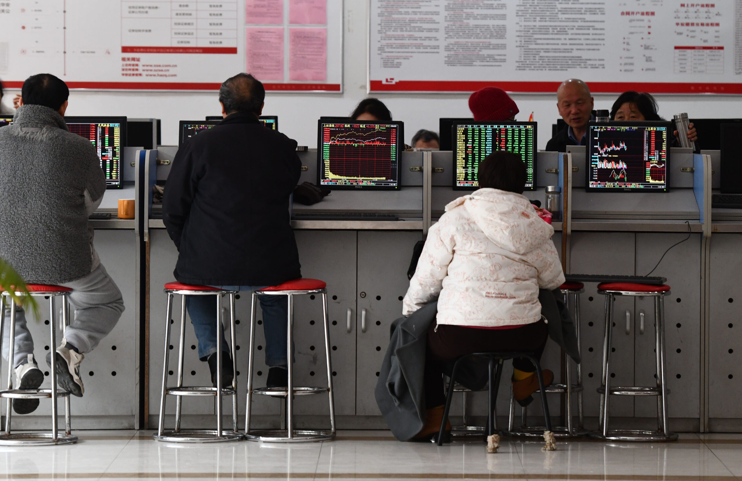 Investors focus on the stock market at a securities business hall in Fuyang, eastern China’s Anhui province, on December 29, 2023.