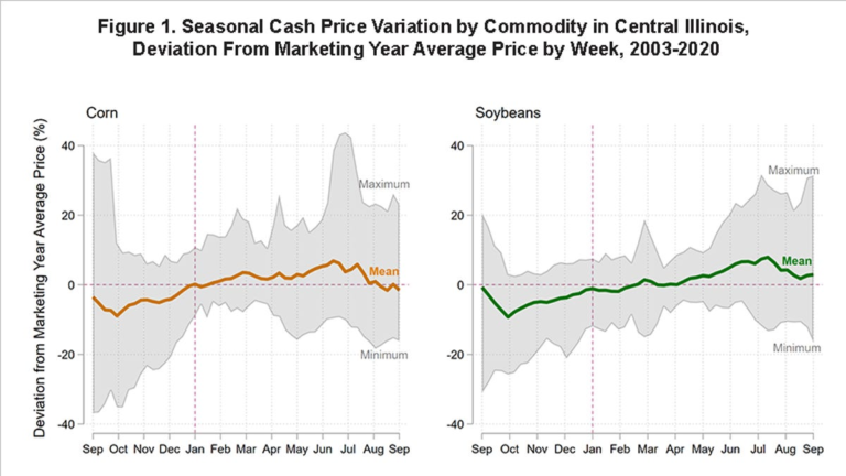 When prices rise late in the marketing year, a typical seasonal price pattern, farm managers and other decision makers in the grain supply chain have an incentive to store grain and sell it for post-harvest delivery. It can be obtained. Figure 1 illustrates seasonal patterns for corn and soybeans using USDA Agricultural Marketing Service cash market price data for central Illinois from the 2004-2005 through 2019-20 market years. Note that the corn and soybean sales year runs from September 1 to August 31 of the following year.